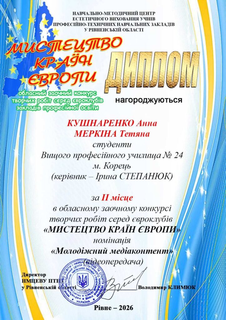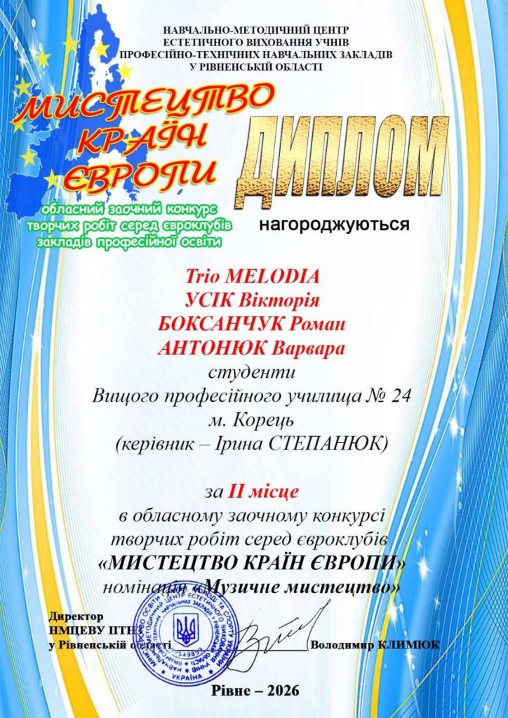 Ще одна приємна новина до скарбнички досягнень Вищого професійного училища №24 м. Корець 💛💙Наші талановиті студенти гідно представили заклад на обласному заочному конкурсі творчих робіт серед євроклубів закладів професійної освіти «Мистецтво країн Європи» 🎶 Номінація «Музичне мистецтво» — ІІ місце🏆 Trio MELODIA: — УСІК Вікторія — БОКСАНЧУК Роман — АНТОНЮК Варвара📹 Номінація «Молодіжний медіаконтент» (відеопередача) — ІІ місце🏆— КУШНАРЕНКО Анна— МЕРКІНА Тетяна