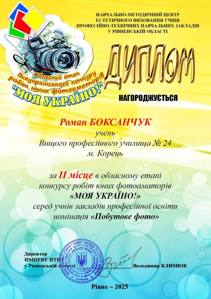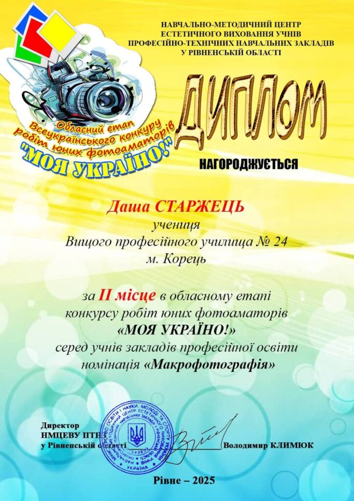 📸Учні Вищого професійного училища №24 м. Корець здобули призові місця в обласному етапі конкурсу юних фотоаматорів «Моя Україно!». Даша Старжець — ІІ місце у номінації «Макрофотографія». Роман Боксанчук — ІІ місце у номінації «Побутове фото».
