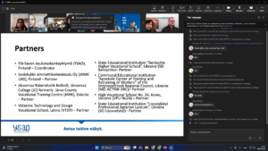 Rea Tuominen, координатор проєкту, керівник WP1 (YSAO), Mari Ruuth, фінансовий адміністратор (YSAO), Katrina Stalsane-Purvinska, експерт з поширення та використання результатів проєкту, керівник WP5 (VTDT), Minna Koskinen, спеціаліст з електронного навчання, керівник WP2 (JAMK UAS), упродовж зустрічі надали детальні консультації щодо основних етапів роботи консорціуму, а також узгодили подальші кроки ефективної співпраці задля досягнення окреслених цілей проєкту.